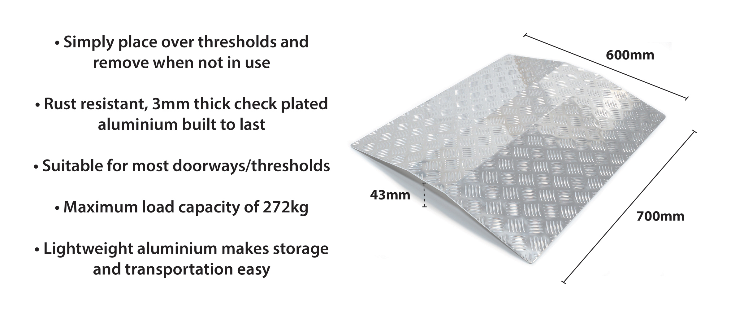 Het geruite aluminium oppervlak zorgt voor een stevige grip tijdens het gebruik, terwijl de roestbestendige afwerking garant staat voor een lange levensduur, zelfs bij intensief gebruik. Aan de onderzijde zijn antislipkussentjes aangebracht die extra stabiliteit bieden en voorkomen dat vloeren of ondergronden beschadigen. De oprijplaat is bovendien direct klaar voor gebruik: installatie gebeurt zonder gereedschap of bevestigingsmateriaal.