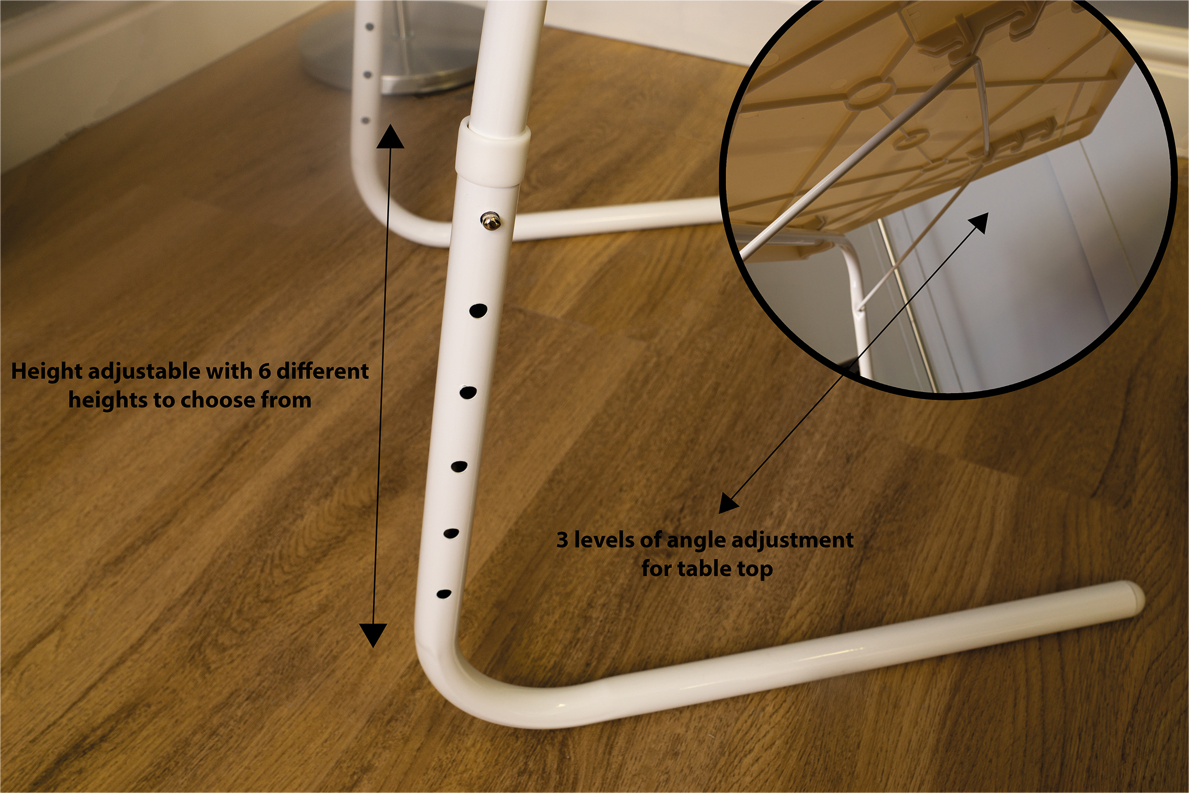 Met zijn zes verschillende hoogte-instellingen is deze mobiele bedtafel ideaal voor verschillende activiteiten. Of je nu vanuit bed werkt of een maaltijd wilt nuttigen, je kunt de tafel eenvoudig aanpassen aan jouw behoeften. Het kantelbare tafelblad zorgt ervoor dat je altijd de juiste hoek kunt vinden voor optimaal comfort.