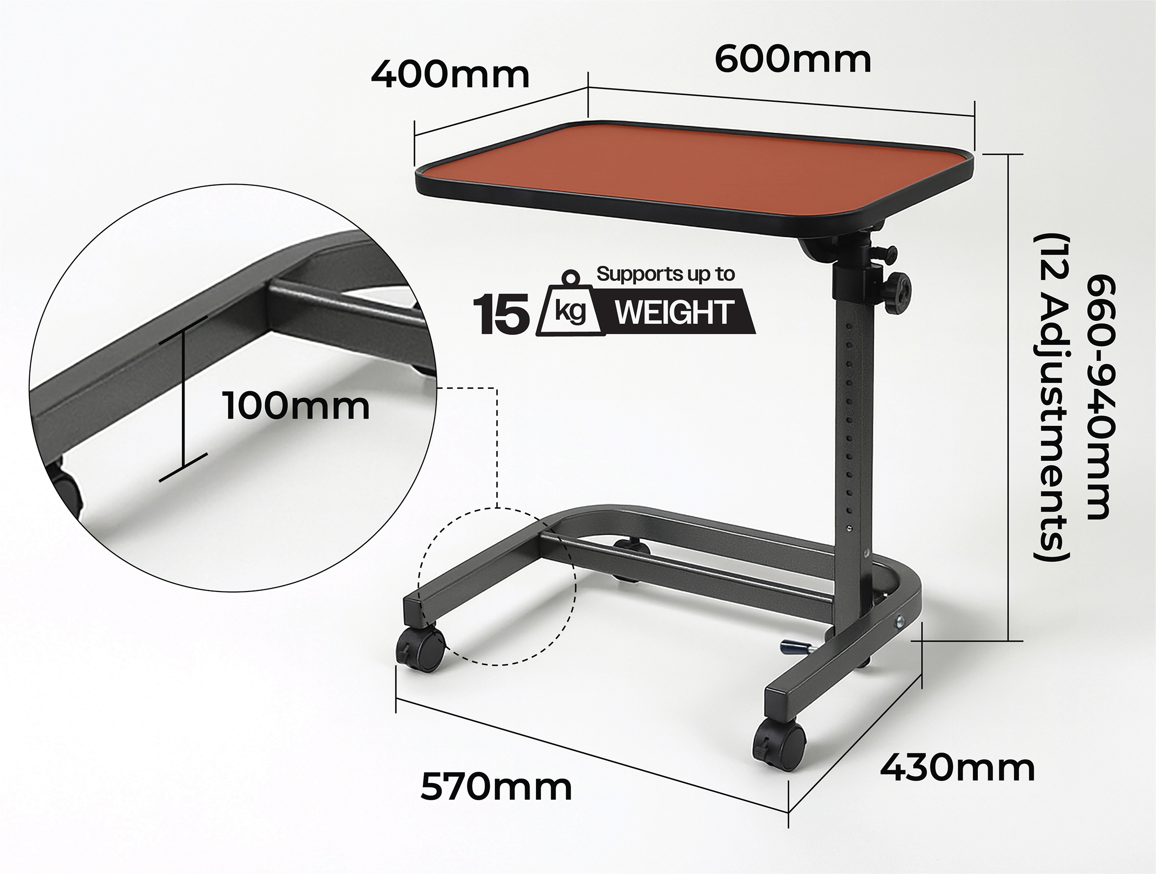 Duurzaam en praktisch – Robuuste stalen voet van 30 mm dik met 10 cm vrije ruimte, waardoor de tafel eenvoudig onder bedden en banken schuift; het gladde oppervlak is eenvoudig schoon te maken