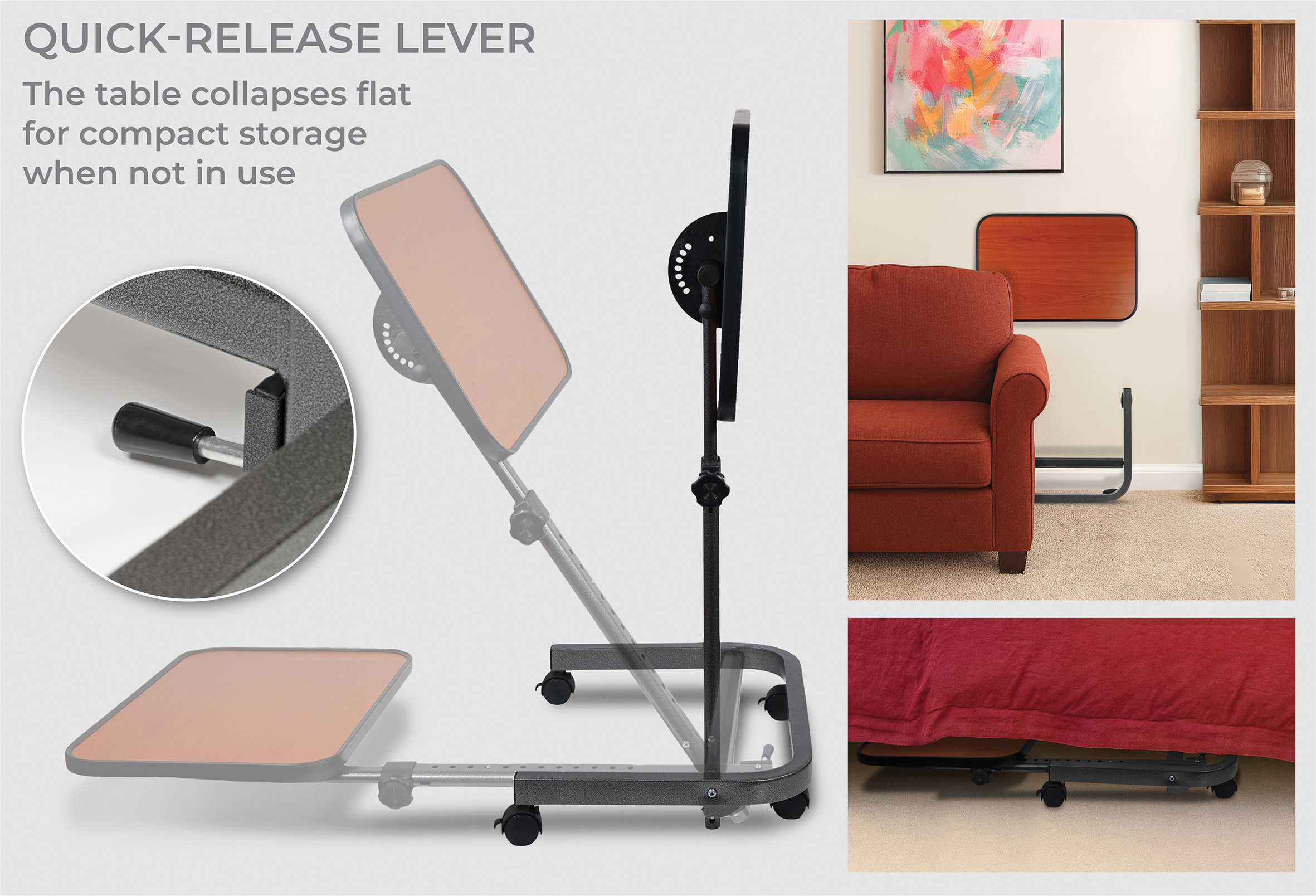 Makkelijk te verplaatsen en op te bergen – Vier geremde zwenkwielen zorgen voor soepele verplaatsing en stabiliteit; dankzij de snelsluiting is de tafel plat inklapbaar en compact op te bergen onder bed of bank
