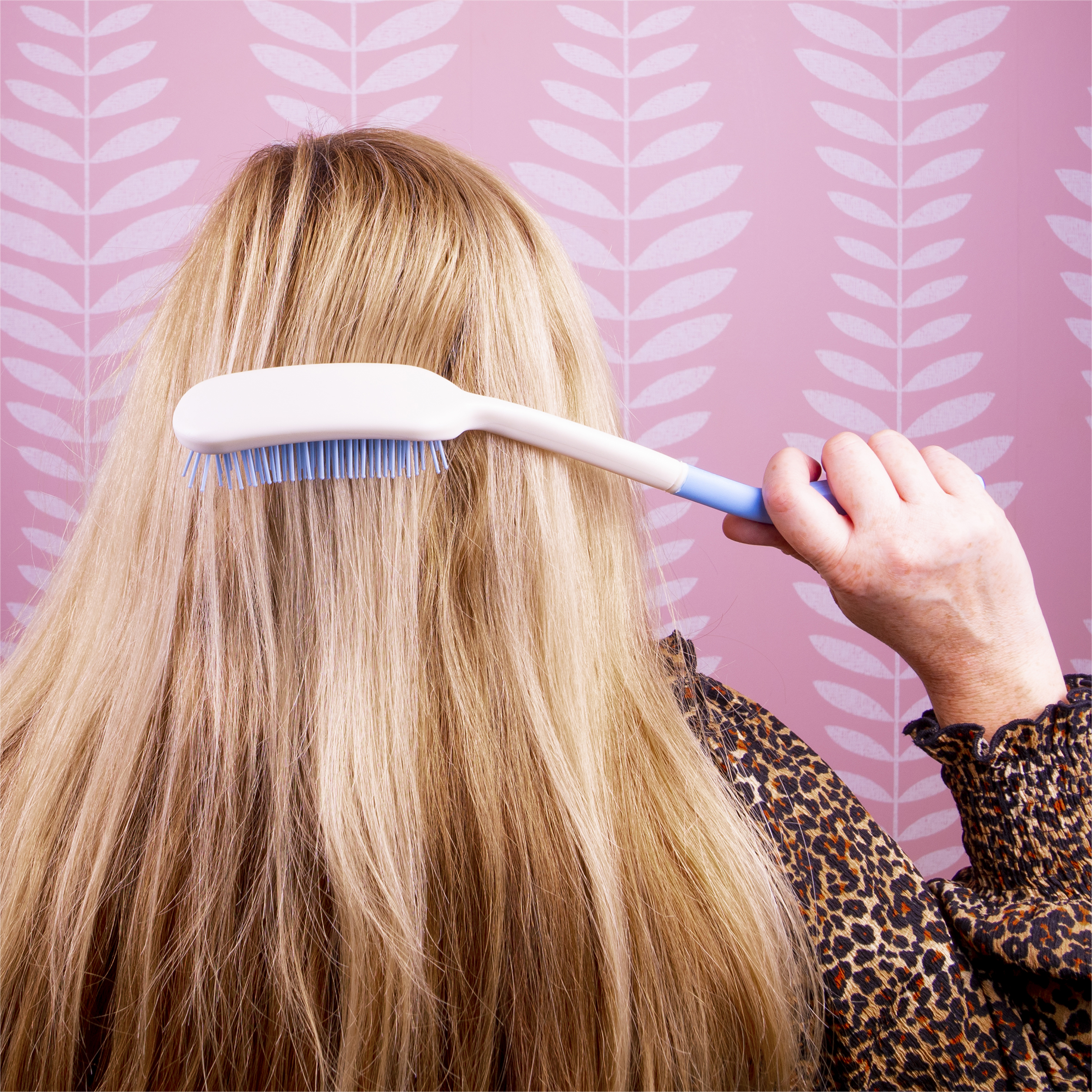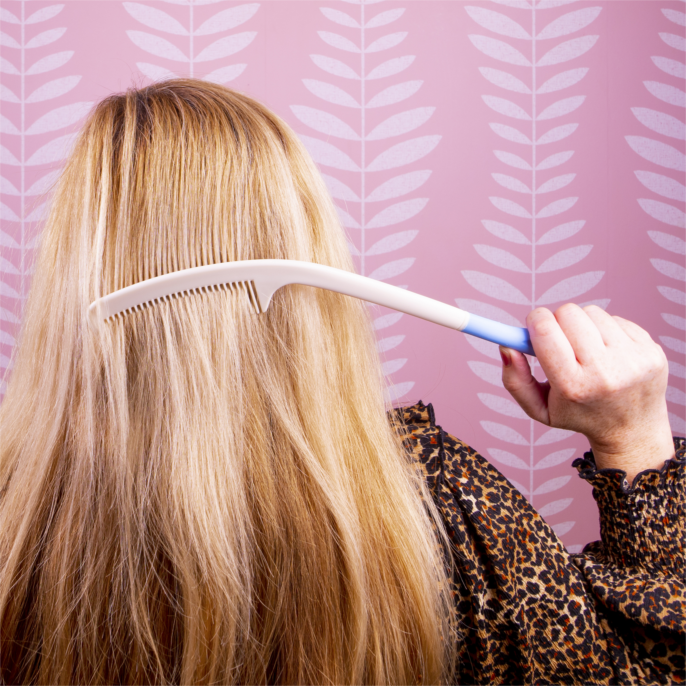 Deze lichtgewicht set is voorzien van extra lange, ergonomisch gevormde handgrepen met een comfortabele grip. De set bevat een kam met kunststof tanden en een zachte borstel en is ideaal voor gebruikers met beperkte arm- of schouderbewegingen.