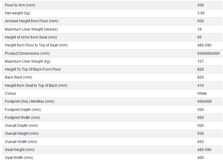 | Gebruikersgewicht douchestoel: | 130kg, 140kg, 150kg, 160kg, 170kg, 180kg, 190kg, 200kg, 230kg |