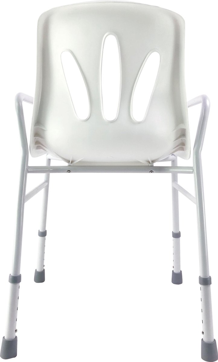 De rugleuning en armsteunen zorgen voor extra ondersteuning en maken het gemakkelijker om te gaan zitten en weer op te staan. De zitting is voorzien van afvoergaten, zodat het water goed kan weglopen en de kans op uitglijden wordt verminderd. Dit zorgt voor een veilige en comfortabele douche-ervaring.