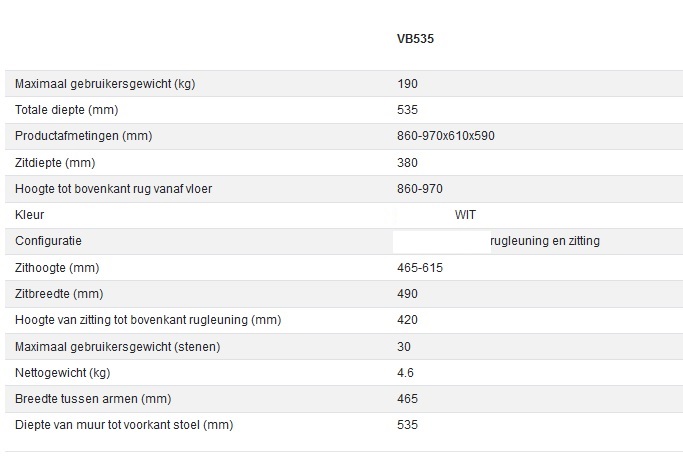 | Gebruikersgewicht douchestoel: | 190kg, 200kg, 230kg |