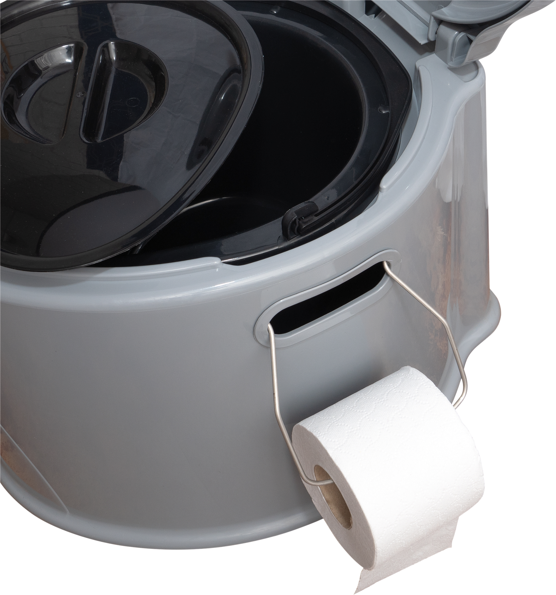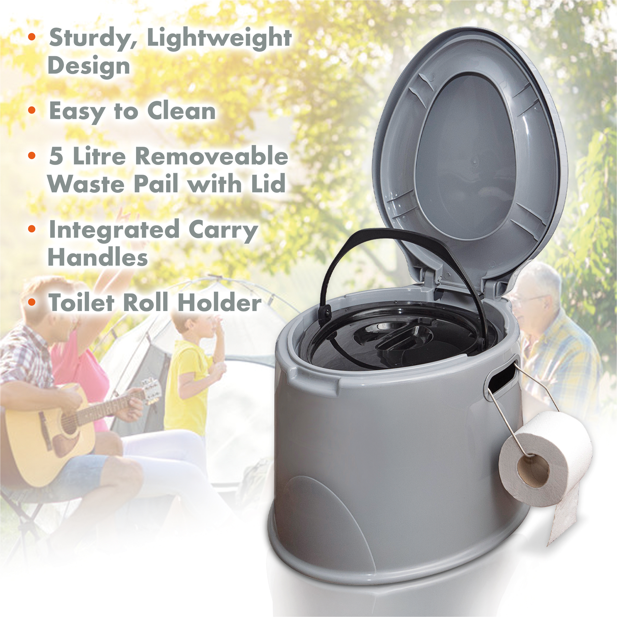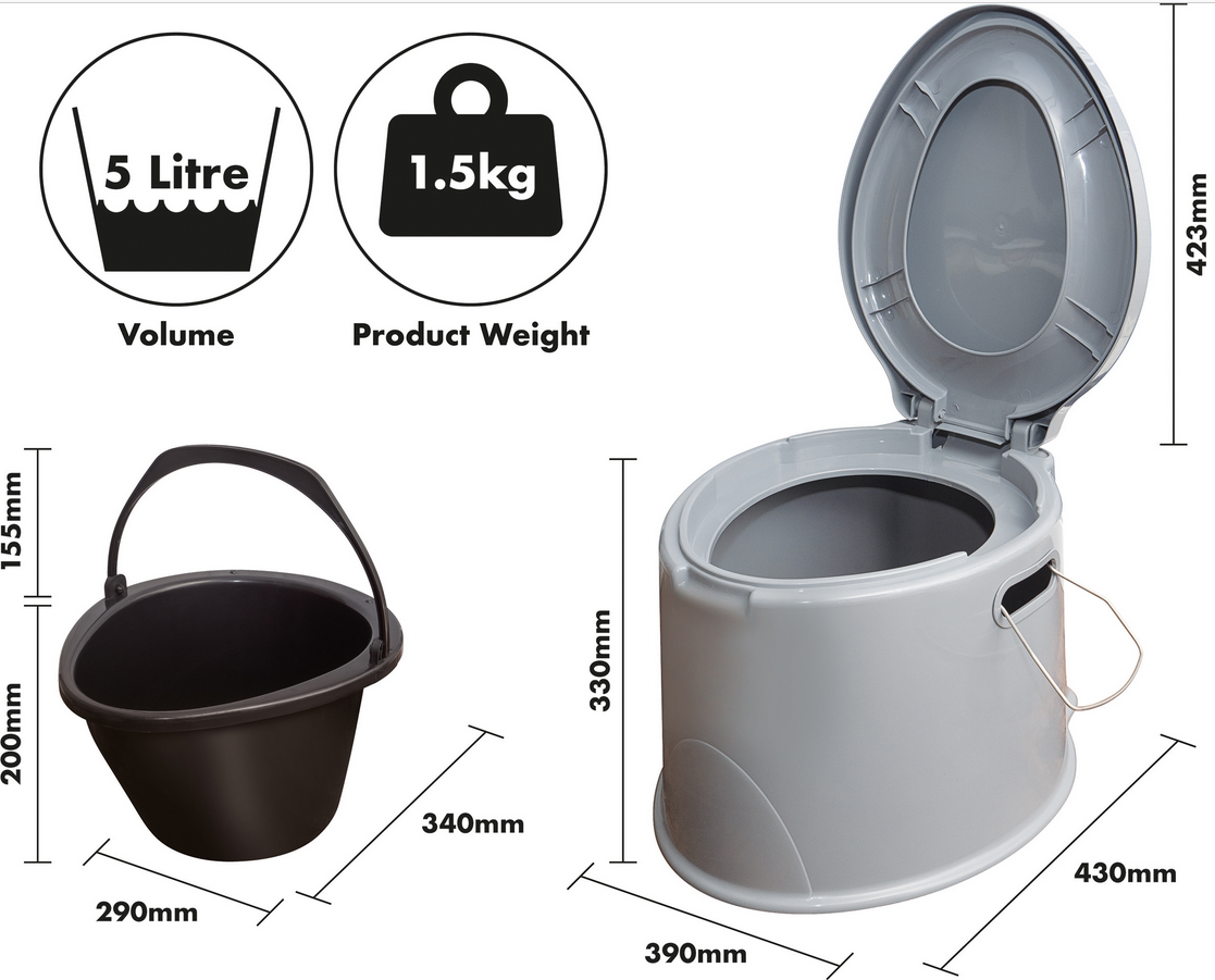 Het draagbare toilet is voorzien van een verwijderbare toiletemmer met deksel, zodat legen en reinigen eenvoudig is. Daarnaast beschikt het over een geïntegreerde toiletrolhouder en stevige handgrepen aan de zijkant voor gemakkelijk verplaatsen. De 5 liter toiletemmer biedt voldoende capaciteit voor meerdaags gebruik.