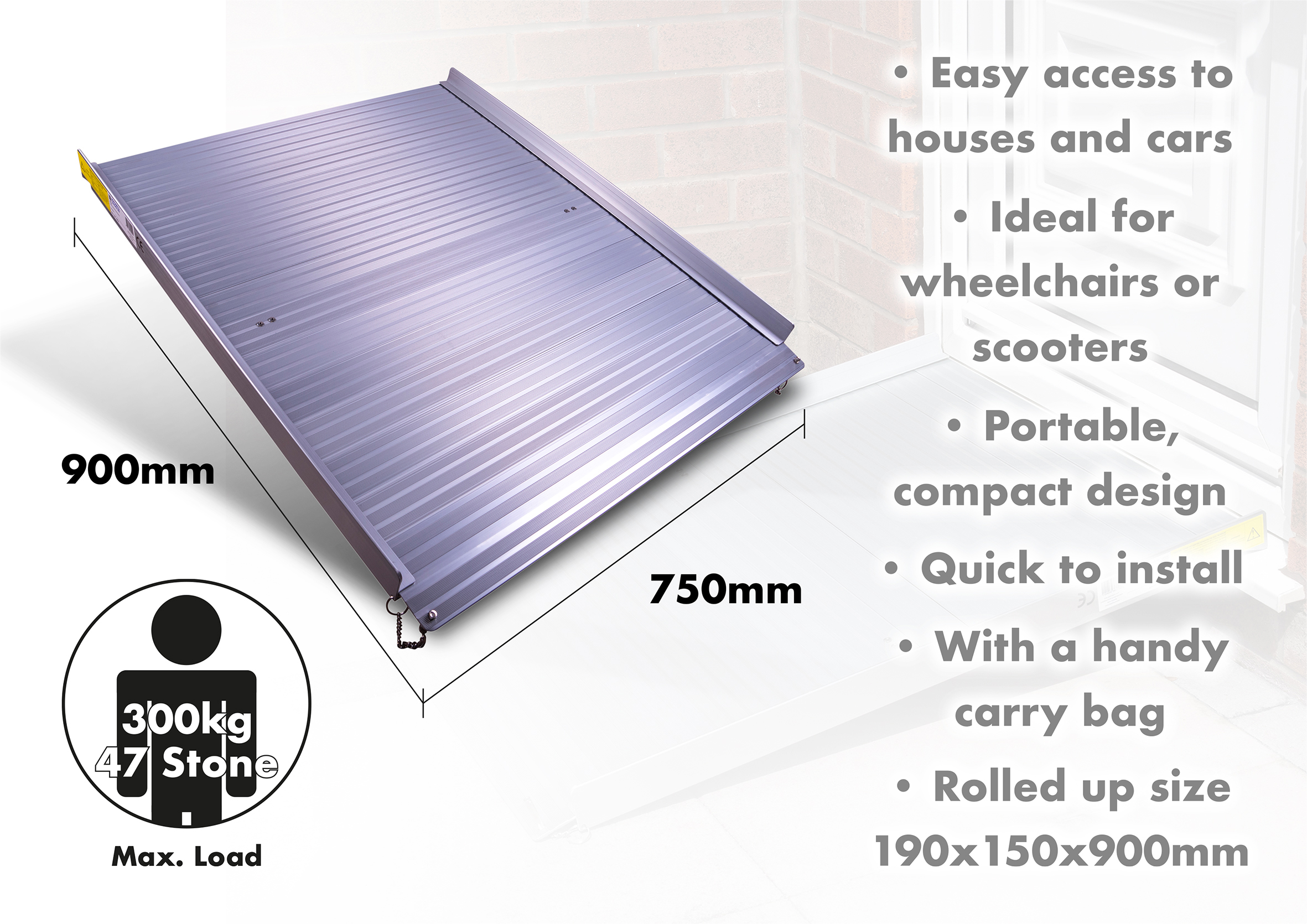 De Aidapt oprolbare oprijplaat is gemaakt van stevig aluminium, wat zorgt voor duurzaamheid en betrouwbaarheid. Met een maximaal laadgewicht van 300 kg, voldoet deze ramp aan de behoeften van de meeste gebruikers. Dankzij het robuuste ontwerp hoef je je geen zorgen te maken over stabiliteit of veiligheid.