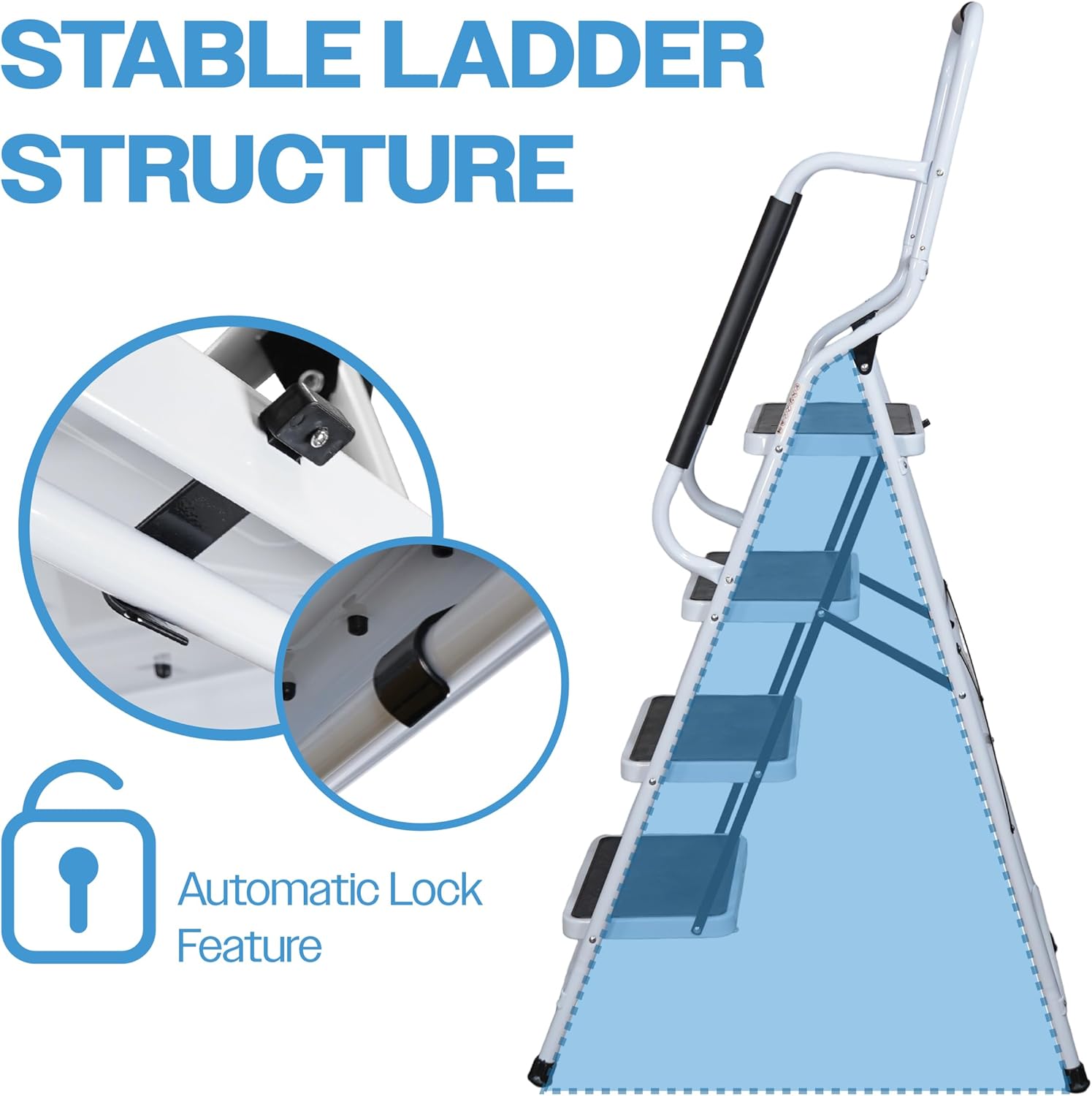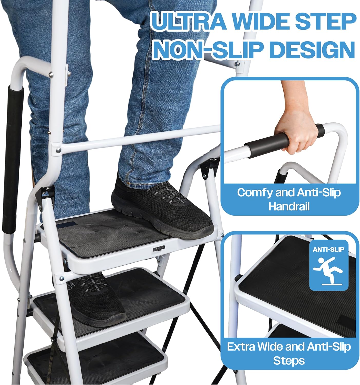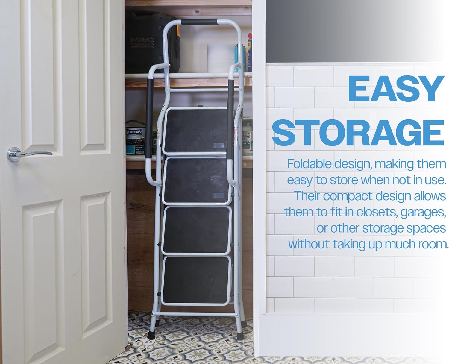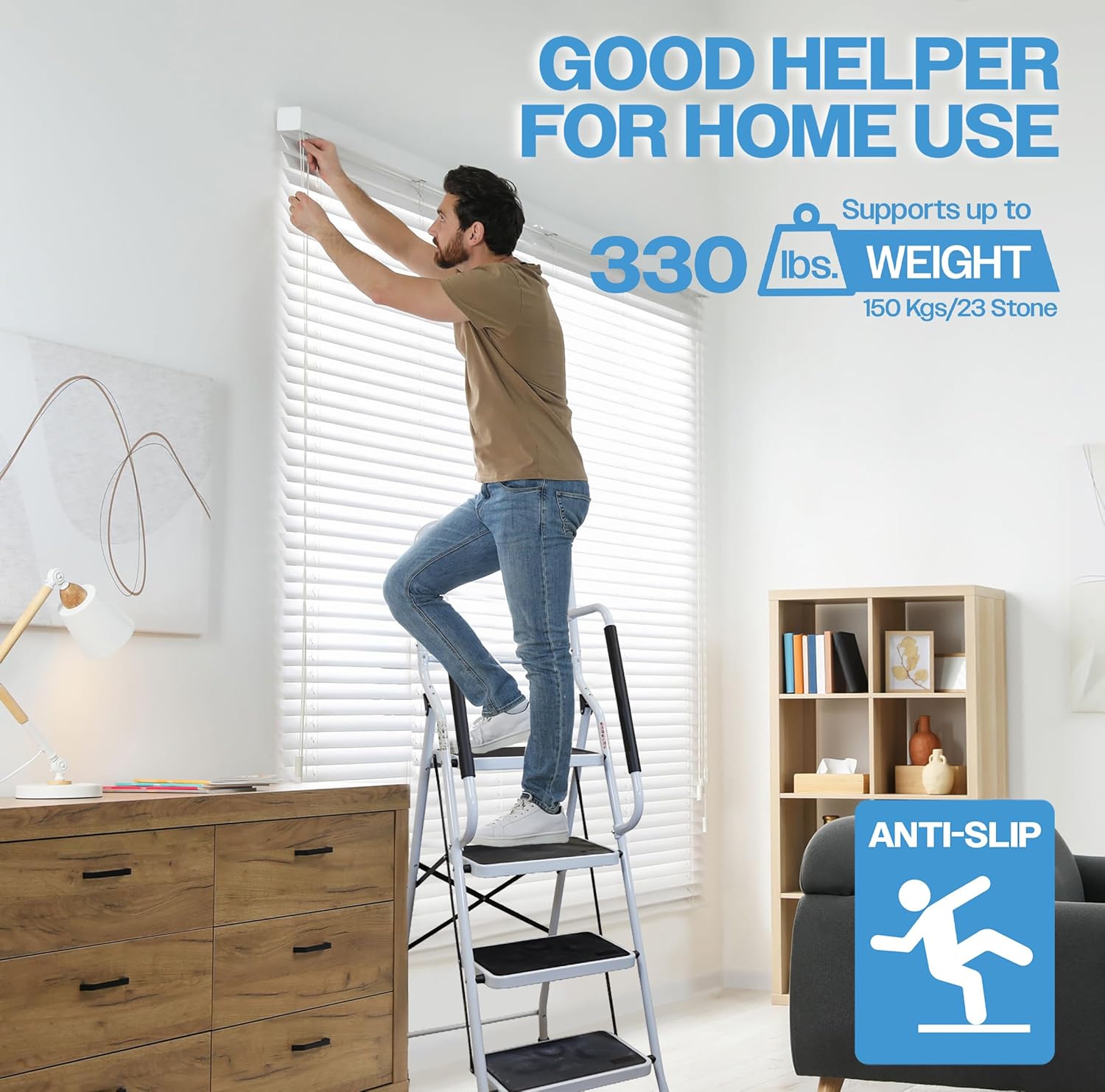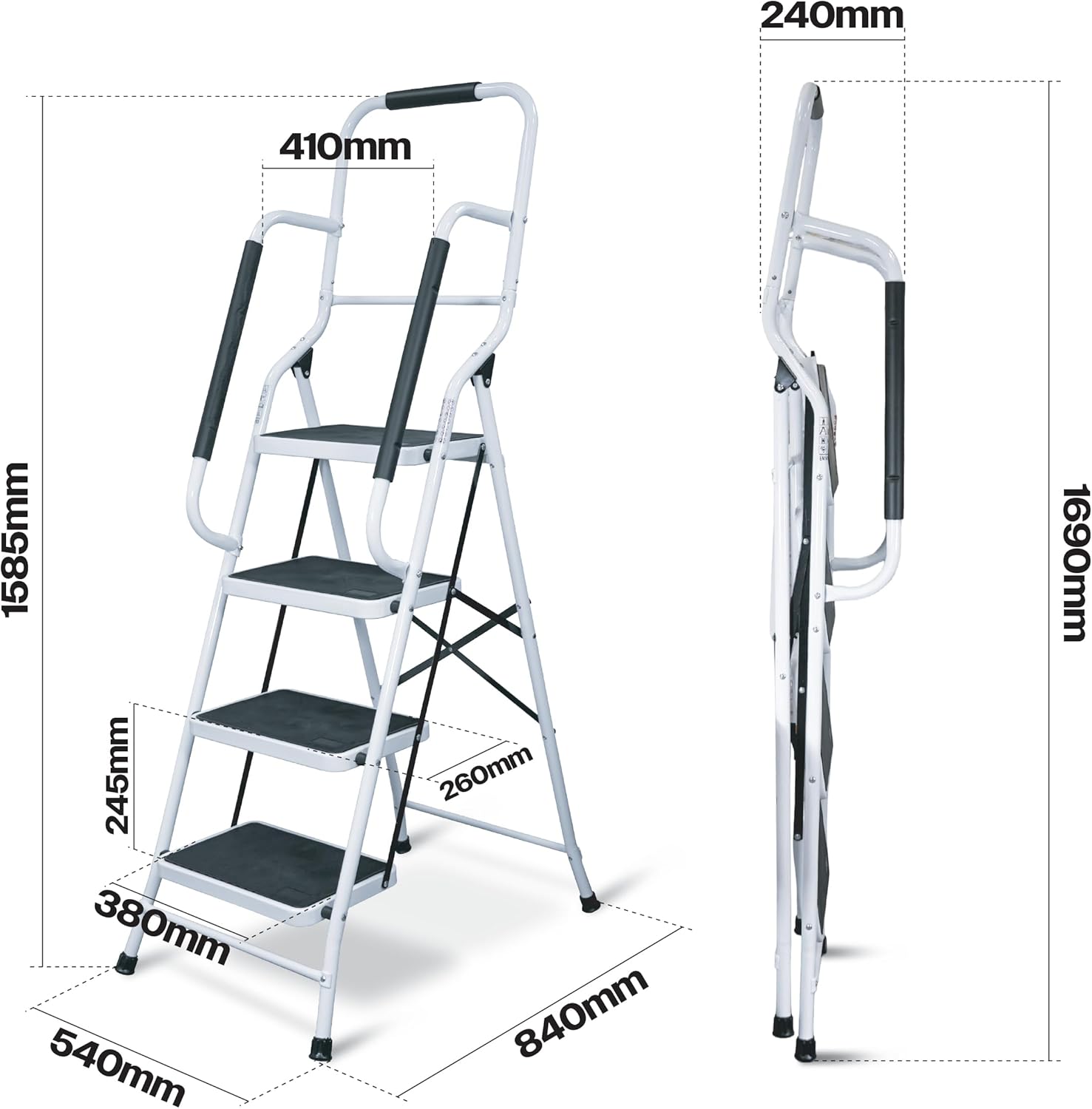 De opstapkruk met leuning is een praktische en veelzijdige oplossing voor zowel thuis als op het werk. Dankzij het stevige ontwerp en de antislip brede pedalen staat u altijd stabiel, of u nu schoonmaakt, een doe-het-zelf-project uitvoert of moeilijk bereikbare plaatsen in huis wilt bereiken. Het compacte, opvouwbare ontwerp maakt het eenvoudig om de kruk op te bergen, zelfs in kleine ruimtes.
