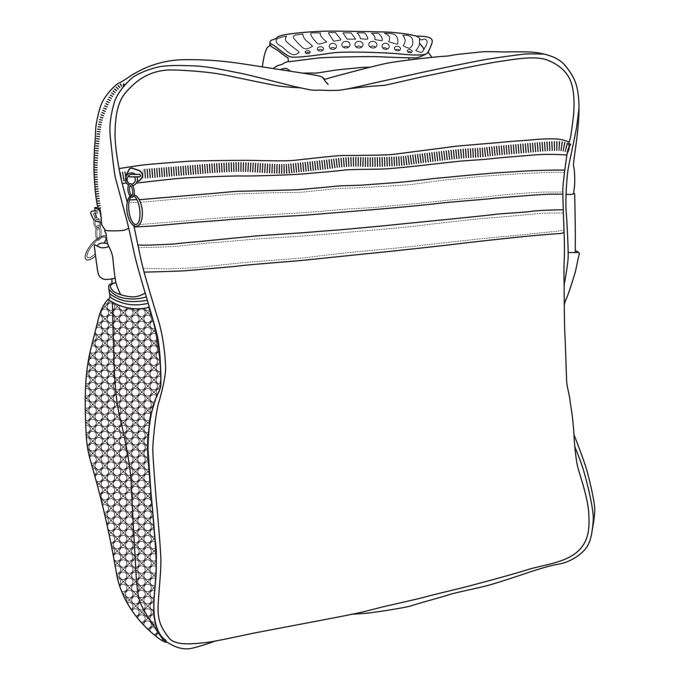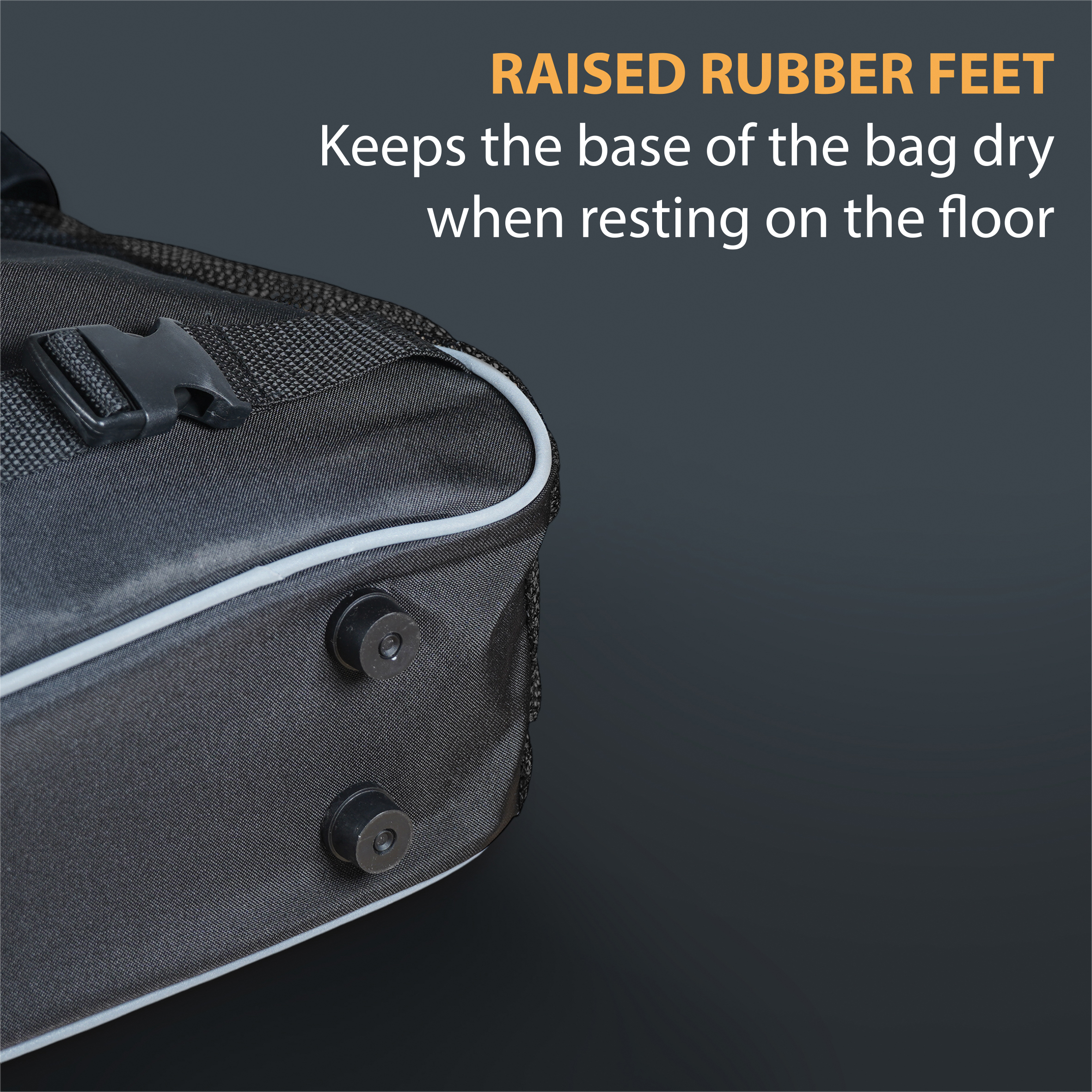 Verhoogde rubberen voetjes houden de tas droog op de vloer