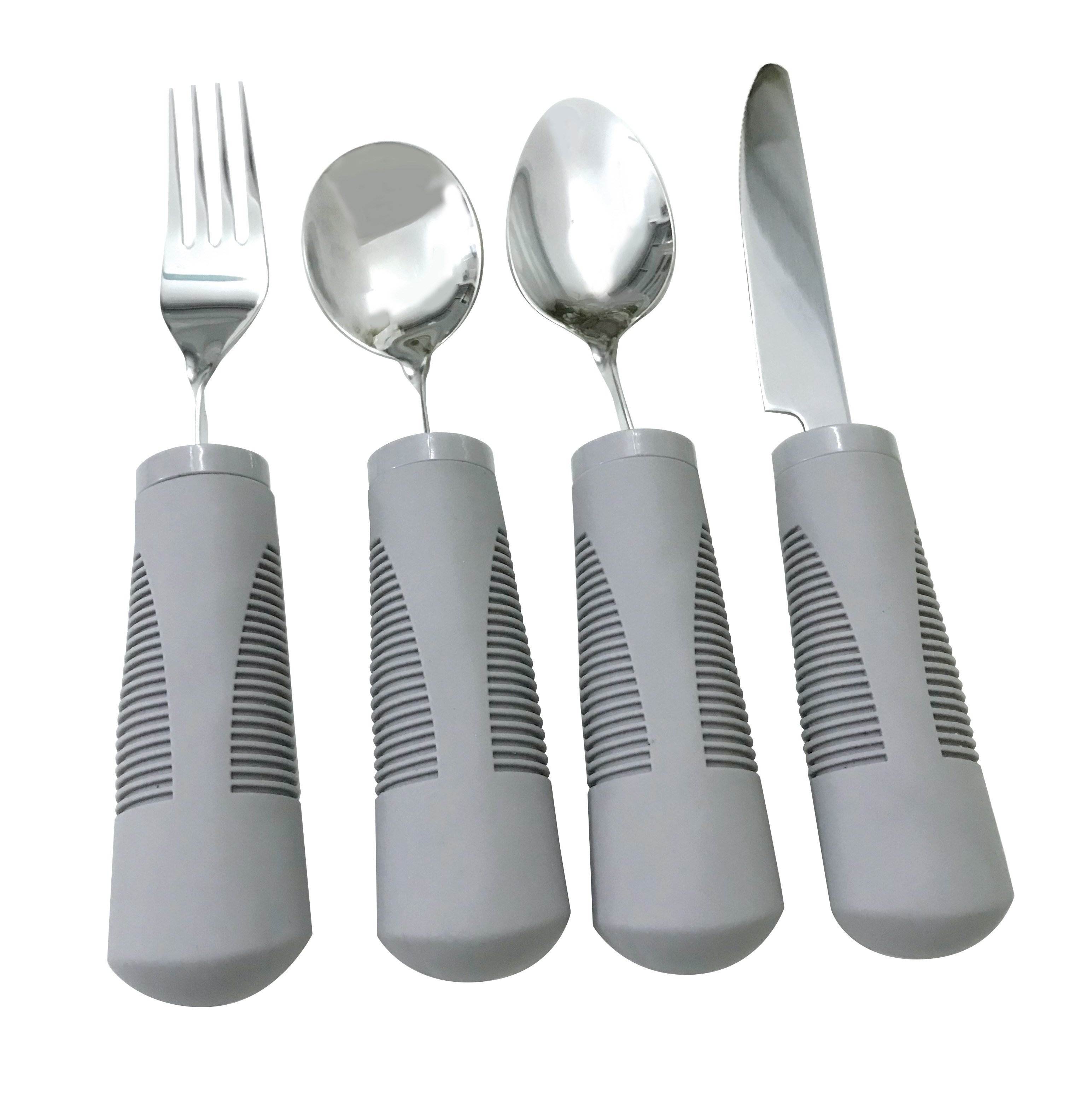 Deze ergonomische bestekset is speciaal ontworpen voor mensen met een beperkte handfunctie, reuma of verminderde spierkracht. De set bestaat uit vier delen: een mes met kartelrand, een vork, een eetlepel en een theelepel.