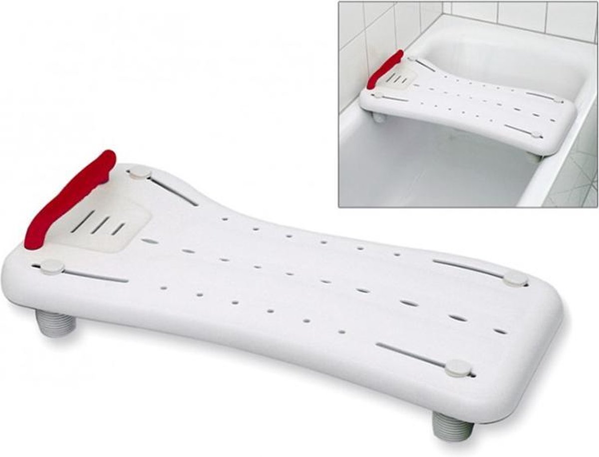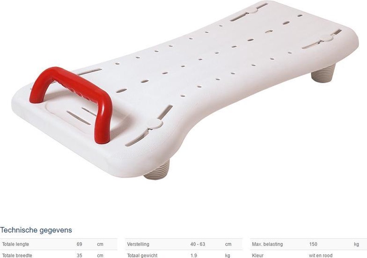 Drive Bathboard Benny 69 cm Comfort, veiligheid en stabiliteit in bad. Deze badplank is een hulpmiddel om veilig en makkelijk in bad te stappen. Breedte instelbaar zodat het product in bijna elk bad past. Het zitvlak is antislip en heeft gaten voor waterafvoer. De plank heeft een handgreep voor extra veiligheid. Deze Benny Badplank wordt eenvoudig en zonder gereedschap geplaatst en beschadigd uw bad niet door het gebruik van rubberen onderdelen.