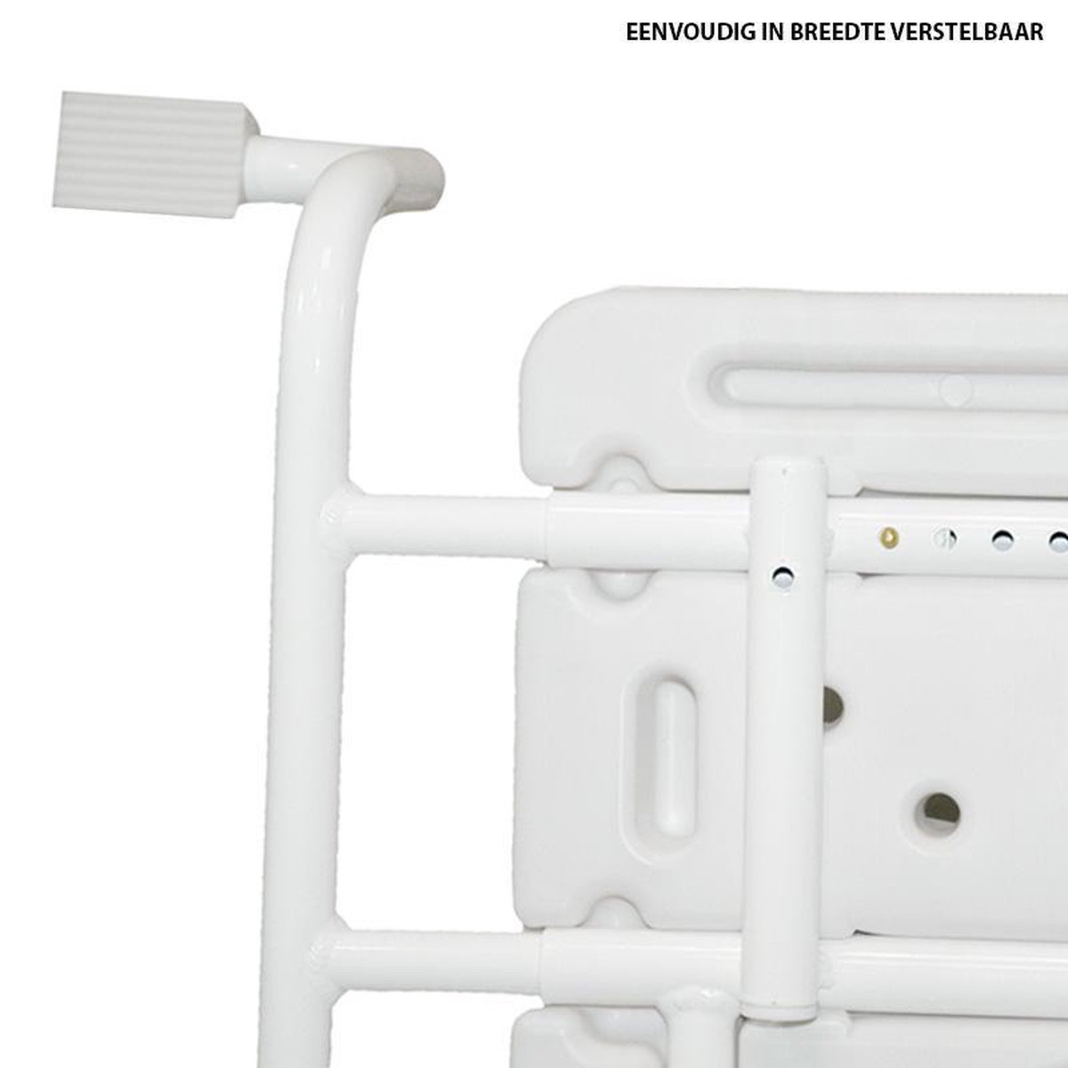 De badzitting is uitgerust met een stevig aluminium frame dat is afgewerkt met een poedercoating voor extra duurzaamheid. De steunbeugels met antislip doppen zorgen ervoor dat de zitting stevig op zijn plaats blijft en niet verschuift tijdens gebruik. Dit verhoogt de veiligheid en maakt de zitting zeer betrouwbaar.