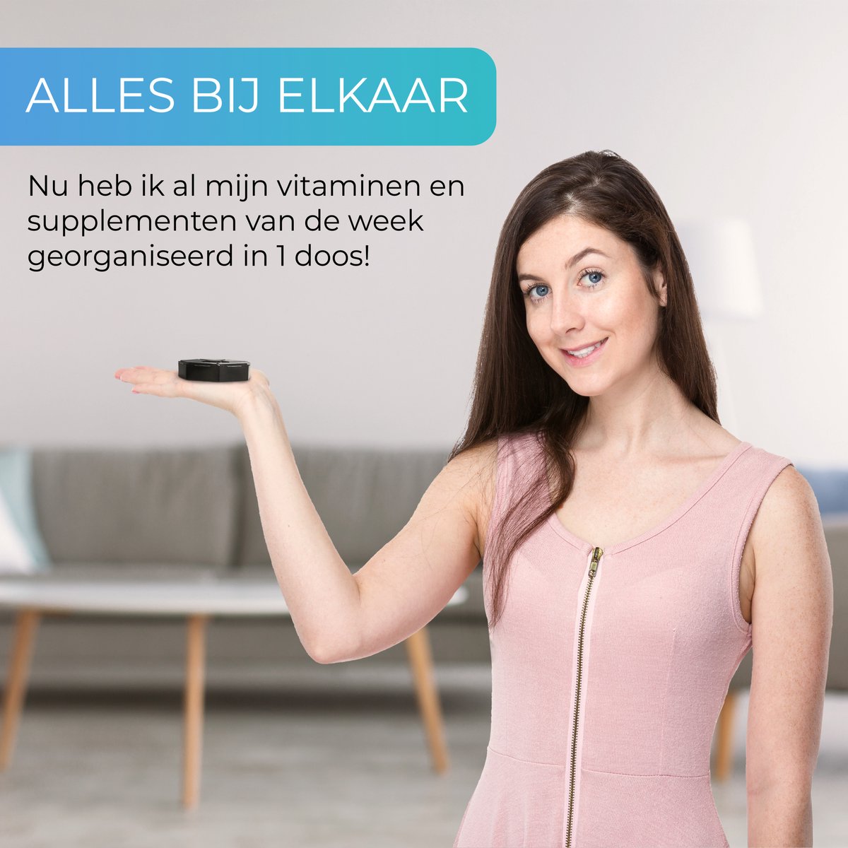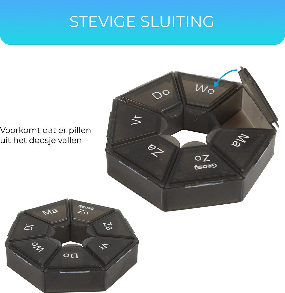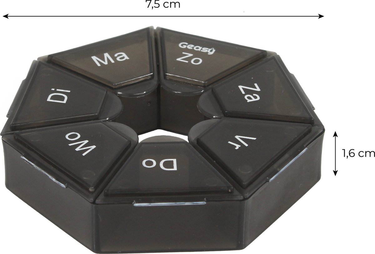 Productinformatie "GEASY Pillendoos 7 Dagen - Stevige Sluiting - Nederlandstalig - Zwart maat M - Pillendoosje - Medicijndoos 7 Dagen - Medicijndoosje"