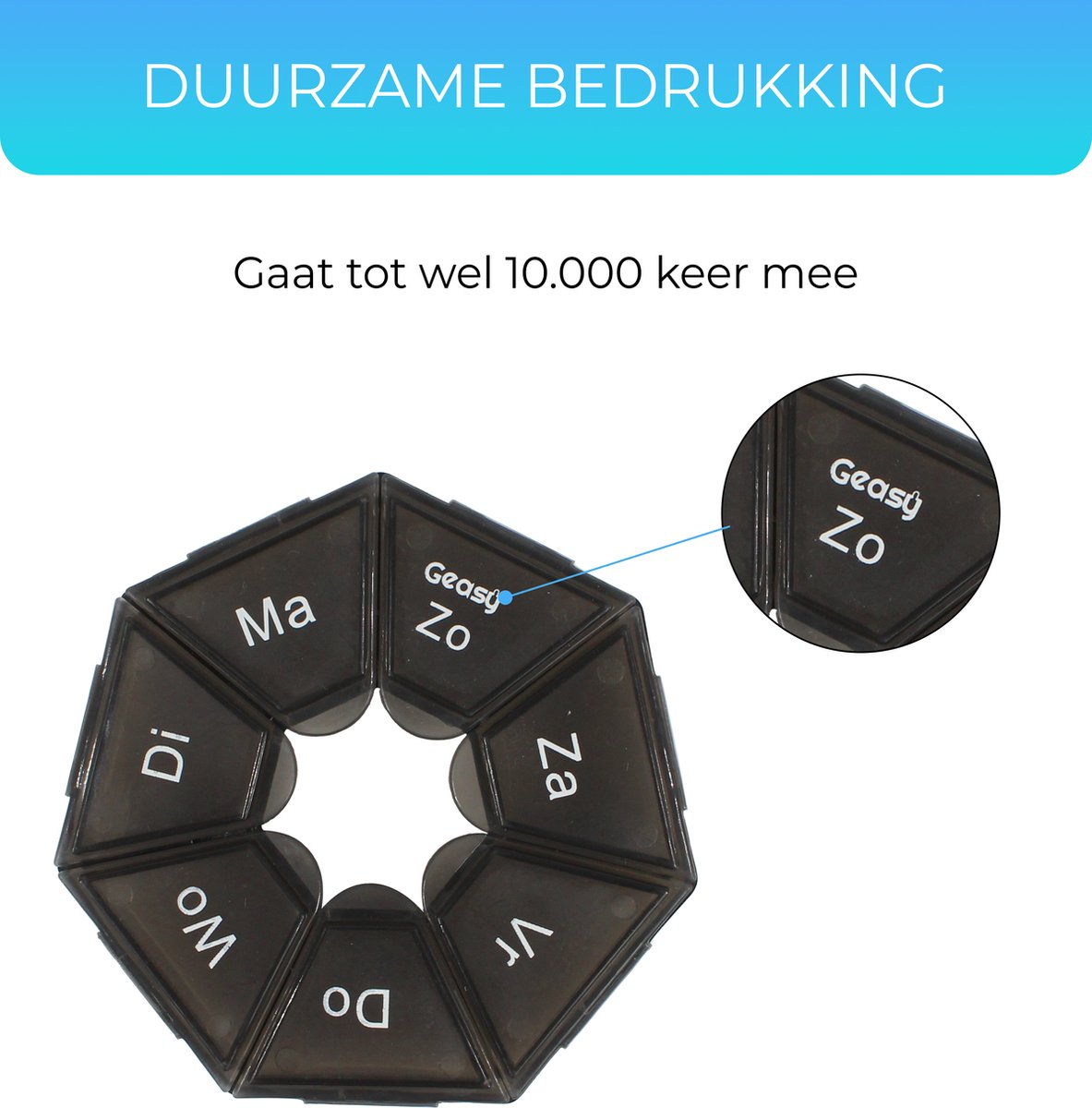 De GEASY pillendoos voor 7 dagen, is speciaal voor mensen die hun medicijnen en pillen gemakkelijk willen organiseren. Het pillendoosje heeft, om verwarring te voorkomen, voor elke dag van de week een eigen vakje. De tekst op de pillendoos is in het Nederlands geschreven waardoor het de ideale pillendoos is voor mensen in Nederland en België. De doosjes hebben een sterke vergrendeling om niet gewenste opening en pillenverlies te voorkomen. De pillendoos is door het formaat en de sterke vergrendeling ook ideaal om mee te nemen op reis.