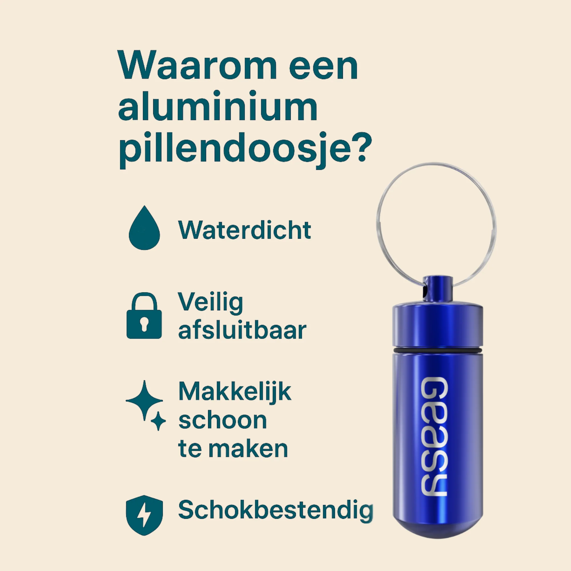 Het blauwe GEASY pillendoosje combineert functionaliteit met een moderne uitstraling. Dankzij het compacte ontwerp en de praktische sleutelhanger is dit medicijndoosje ideaal voor onderweg, op reis of dagelijks gebruik. Het stevige metalen materiaal en de waterdichte schroefdop zorgen ervoor dat uw medicijnen altijd veilig en droog blijven, waar u ook bent.