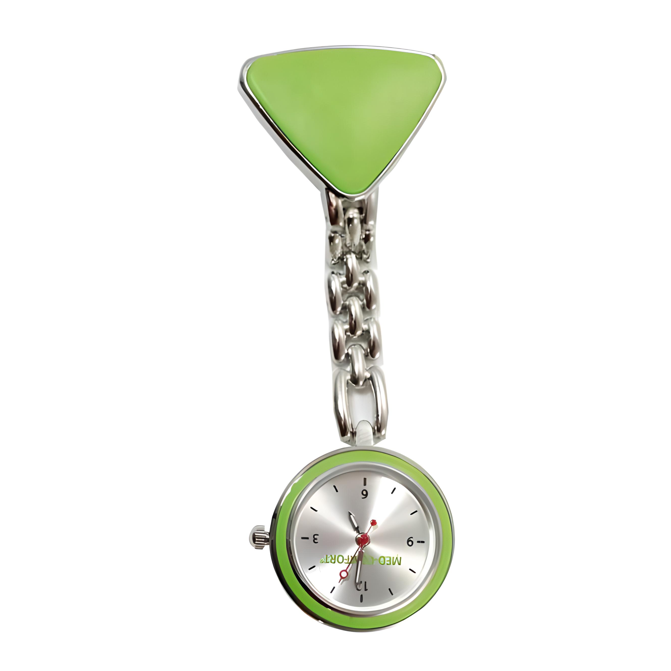 Dit zusterhorloge in groen-zilver is ontworpen met oog voor detail en functionaliteit. Dankzij de stevige clip kan het horloge eenvoudig aan een uniform of borstzak worden bevestigd, waardoor het ideaal is voor gebruik in de zorgsector. De wijzerplaat is 180 graden gedraaid, zodat de tijd gemakkelijk is af te lezen vanuit de natuurlijke kijkhoek van de drager.