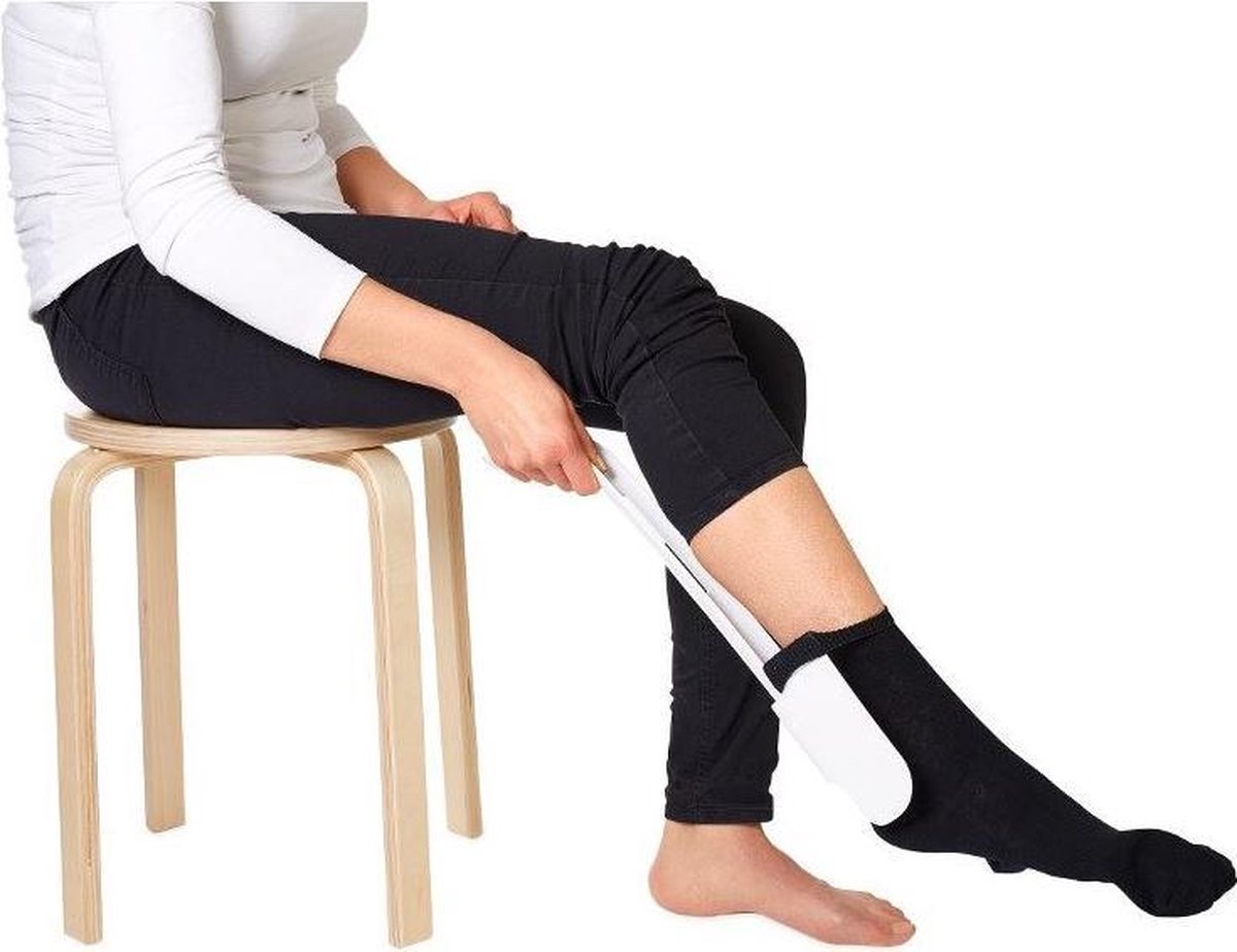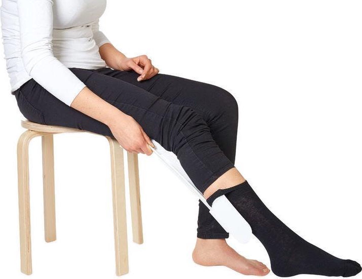 - Men steekt de tenen in de ontstane opening en trekt aan de aantrekhulp en trekt daarmee tegelijkertijd de sok of kous over de voet. De aantrekhulp is alleen geschikt indien men met de handen bij de kuit kan komen.