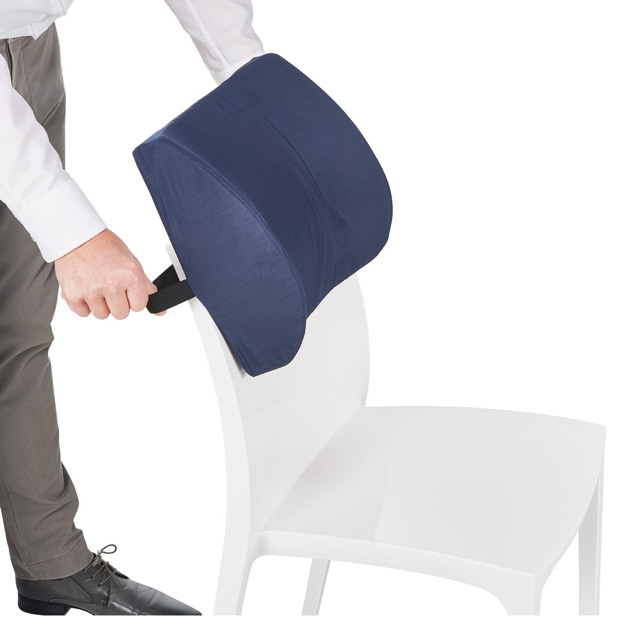 Het kussen is voorgevormd en gemaakt van comfortabel foam, waardoor het zich goed naar de rug aanpast. Met de elastische band blijft het stevig op zijn plaats, zodat u altijd profiteert van optimale steun zonder verschuiven.
