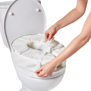 De toiletverhoger past op ieder standaard toilet en wordt met vier klittenbandsluitingen stevig bevestigd. De afneembare hoes kan op 30 °C in de wasmachine worden gewassen, waardoor de toiletverhoger hygiënisch en fris blijft.
